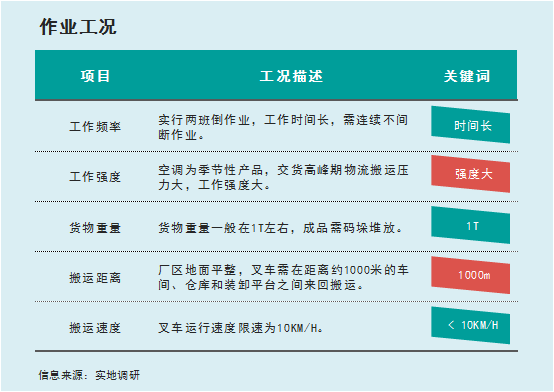 第三,廠區(qū)地面平整,叉車需在距離約1000米的車間、倉(cāng)庫(kù)和裝卸平臺(tái)之間來回搬運(yùn);